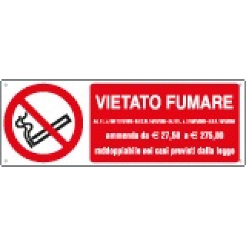 Cartello "Vietato fumare" con riferimento Legge e sanzione EN ISO 7010 alluminio spess. 5/10 mm. 350x125-E18088K